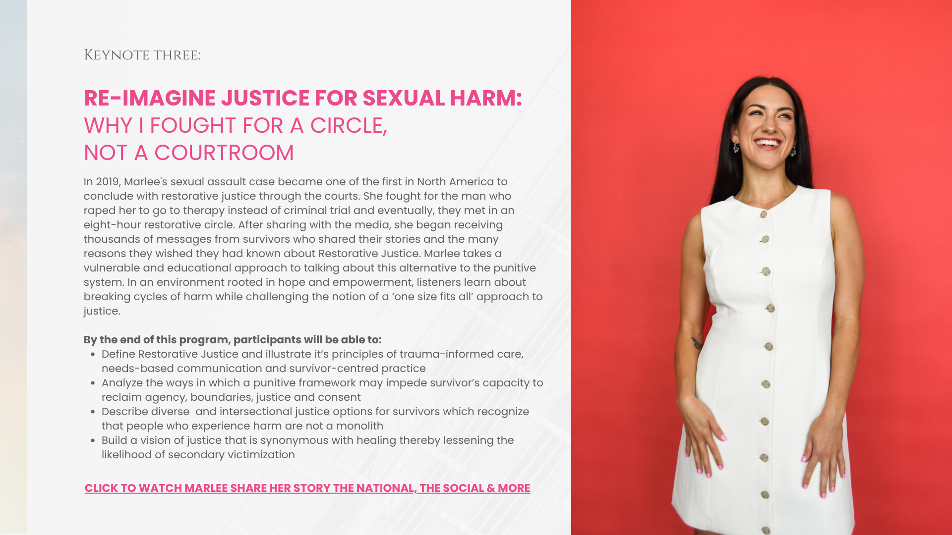 National Sexual Assault Conference, National Organization for Victim Advocacy (NOVA) 50th Annual Conference, Hill Air Force Base SAPR, Trauma & Recovery Conference, Internal Family Systems Conference, Fordham School of Law, Vanderbilt University, National Restorative Justice Symposium, Georgetown University, University of Oregon, University of Toronto, Seneca College, Department of Justice, US Military SAPRO, PEI Human Rights Commission, Justice Options for Women PEI, Women’s Mental Health Conference at Yale, Canadian Centre for Gender & Sexuality Diversity, Consent Conference, Supporting Survivors Conference - Ellis-Gluckstein Lawyers, Journey Project Newfoundland, Safe Passage & Catawba Nation, University of Waterloo, Justice as Trauma Conference, Western University, Barnard College, University of San Fransisco, Niagara College, Humber College, Université de Montreal and more. See all press & past speaking engagements here..